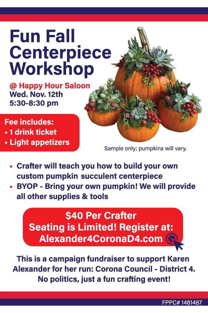 Support Karen Alexander's campaign for Corona City Council, District 4, while crafting a pumpkin centerpiece. Snacks and a drink included!